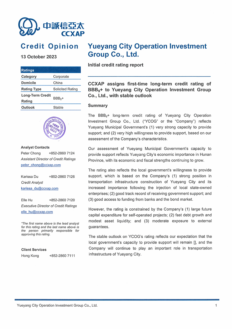 10月13日,中国诚信(亚太)信用评级有限公司(“中诚信亚太”)首次授予岳阳市城市运营投资集团有限公司长期信用评级为BBBg+,评级展望为稳定。这是岳阳市城运集团首次取得投资级的国际评级,充分体现了头部评级机构对岳阳市及岳阳市城运集团综合实力和发展潜力的高度认可。