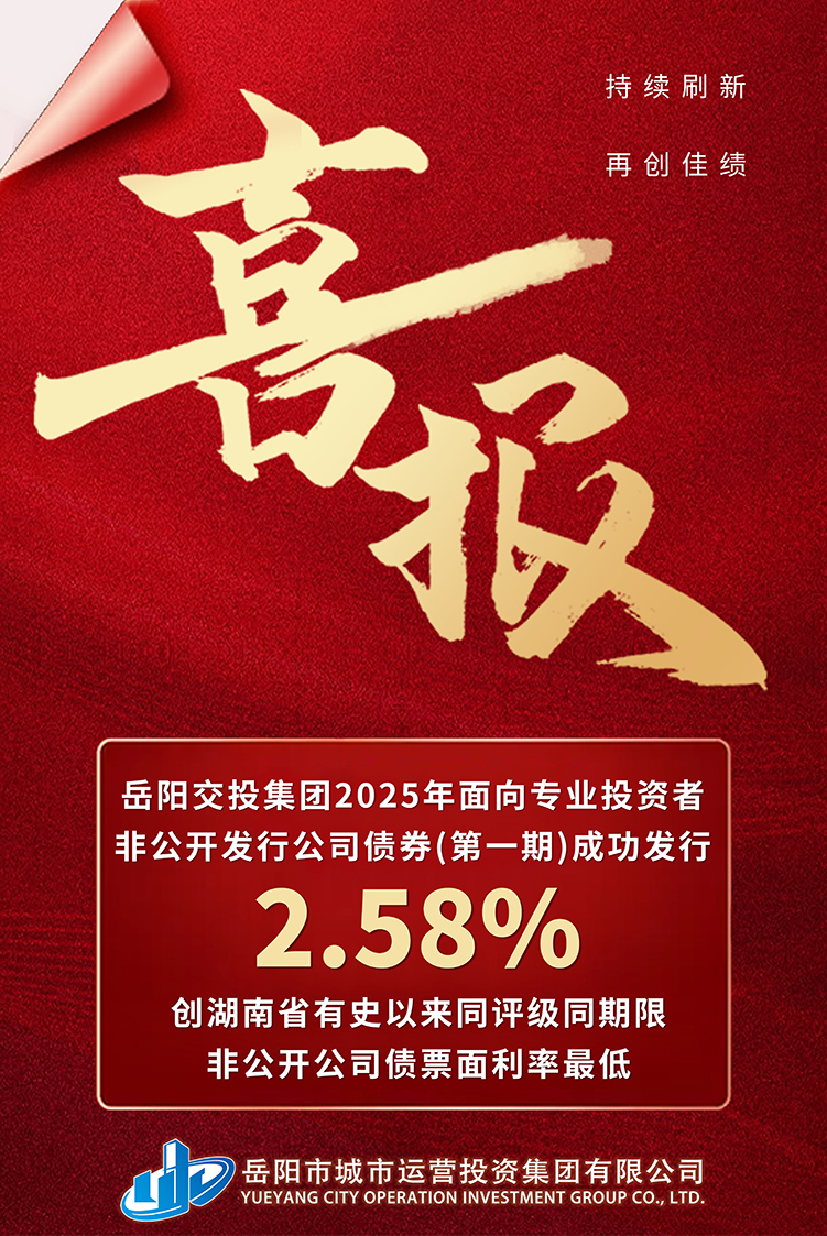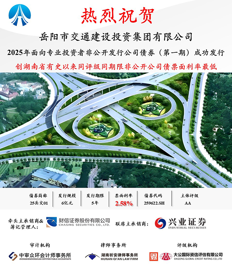 2025年8月4日,岳阳市交通建设投资集团有限公司成功发行2025年面向专业投资者非公开发行公司债券(第一期)(25岳交01)。本次债券发行规模6亿元,期限5年期(不含权),票面利率为2.58%,市场认购热情高涨,获3.15倍超额认购。本次发行由财信证券、兴业证券联合担任主承销商,审计机构为中审众环会计师事务所,评级机构为大公国际资信评估有限公司,法律顾问为湖南祈安律师事务所,各专业机构协同保障项目高效落地。