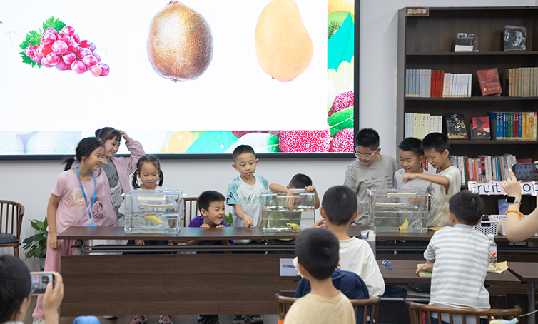 在课堂的最后老师带领孩子们做了一个有趣的实验,孩子们纷纷变成水果科学家,探索水果的奥秘。