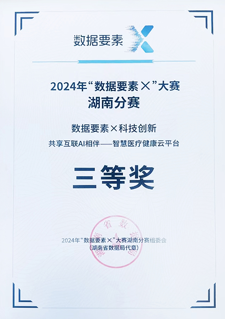 在2024年“数据要素X”大赛湖南分赛中,市城运集团智城公司的智慧医疗项目:共享互联、AI相伴——智慧医疗健康云平台获大赛科技创新赛道三等奖。